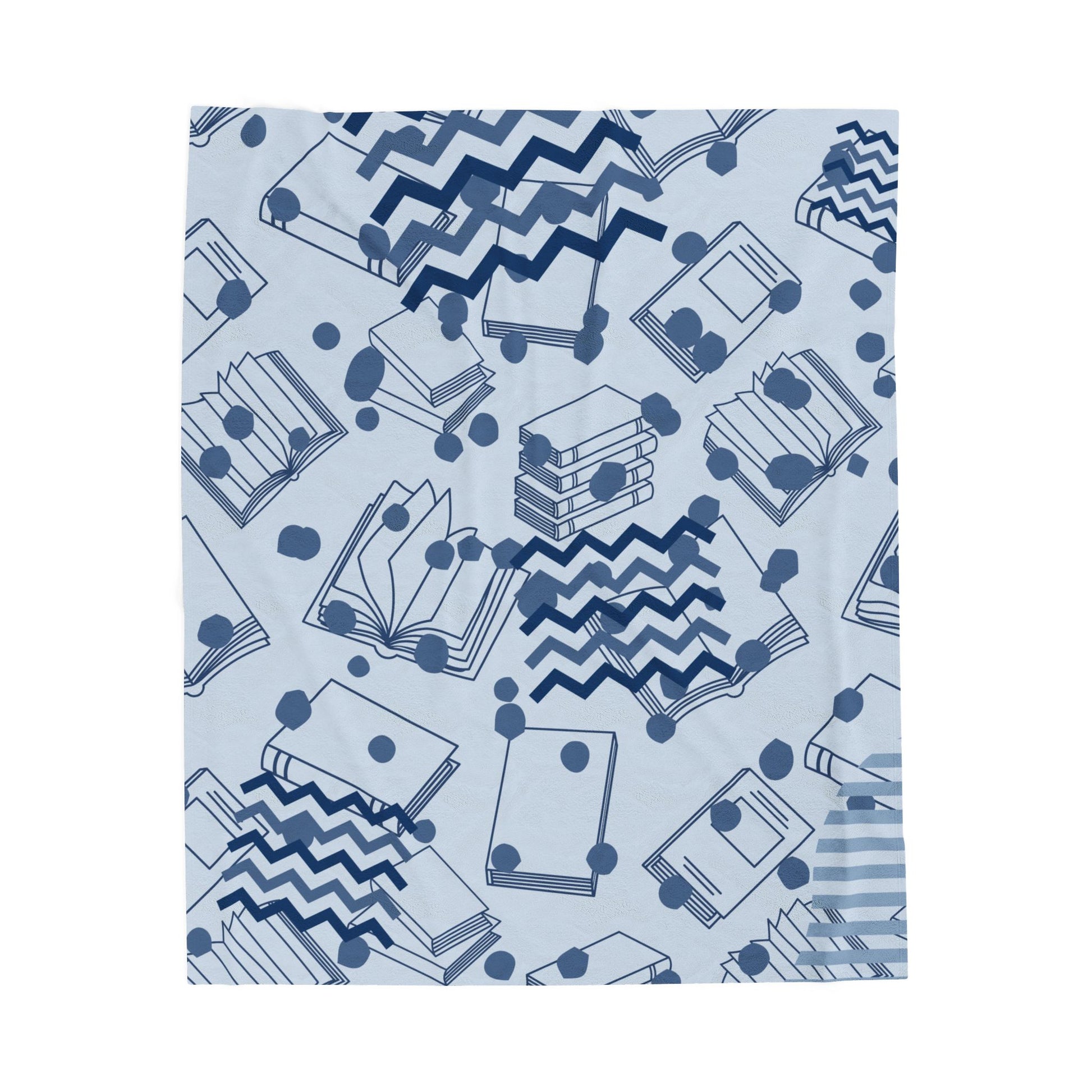 A velveteen plush blanket patterned with book stacks, open pages, and playful chevrons in calming blue tones. It wraps you in a gentle warmth that invites long reading sessions, quiet mornings with tea, or late-night study sprints. The print is vivid on one side, while the reverse stays a soft, clean white—ready to tuck over shoulders, drape across a couch, or spread on a favorite armchair. Lightweight yet substantial, it moves easily between cozy corners and campus dorms, making lazy afternoons feel deliberately slow and restorative.